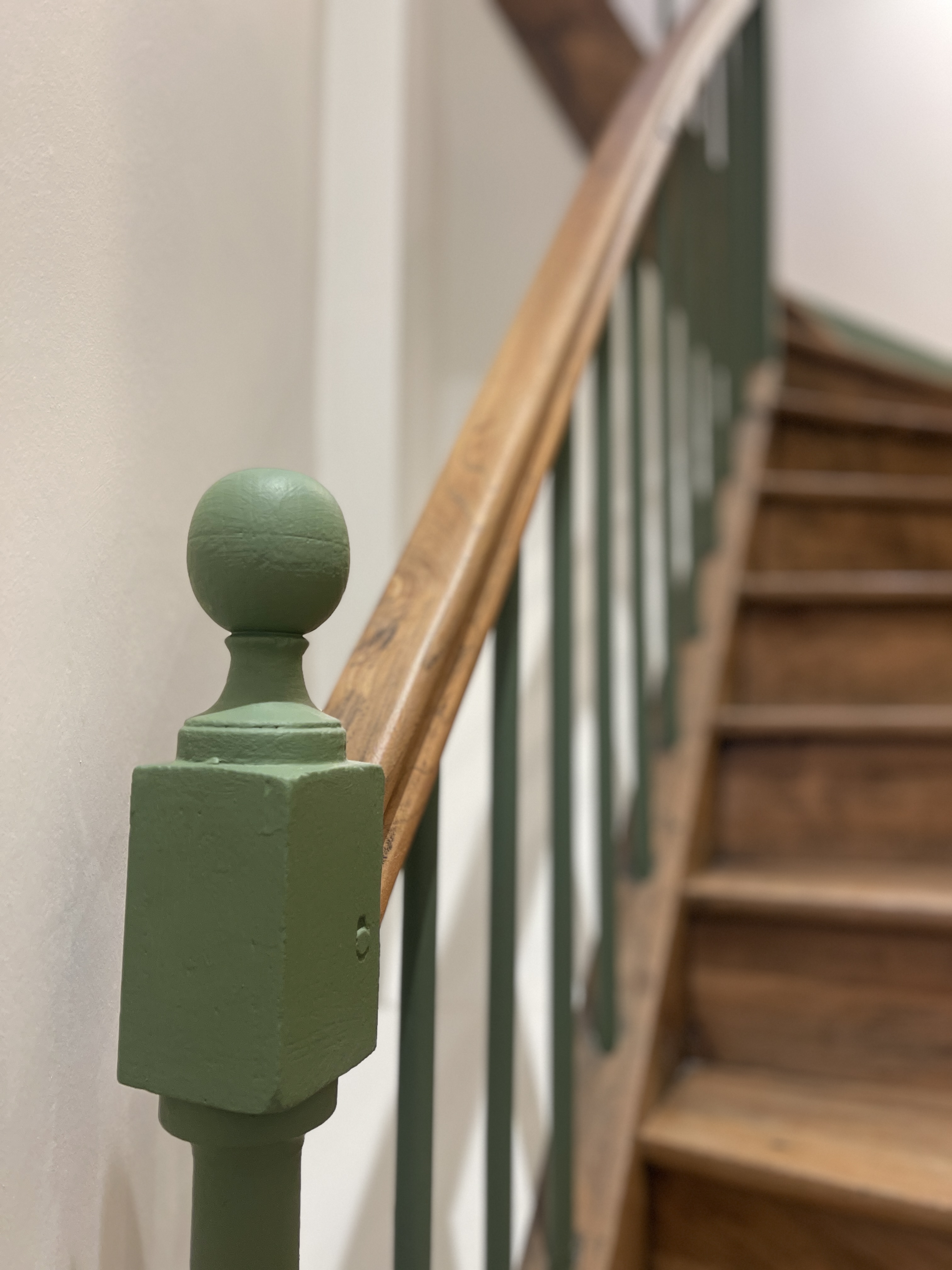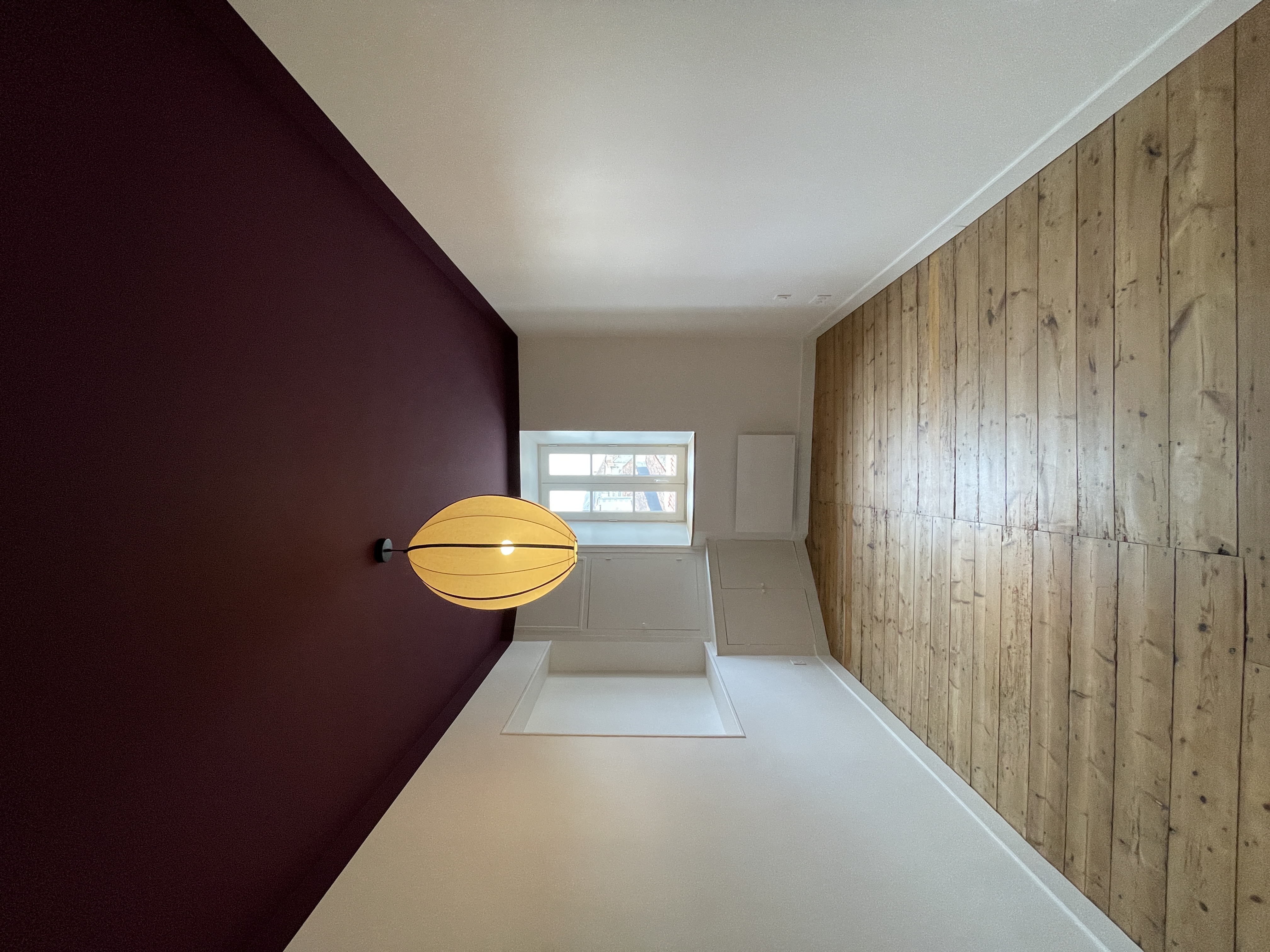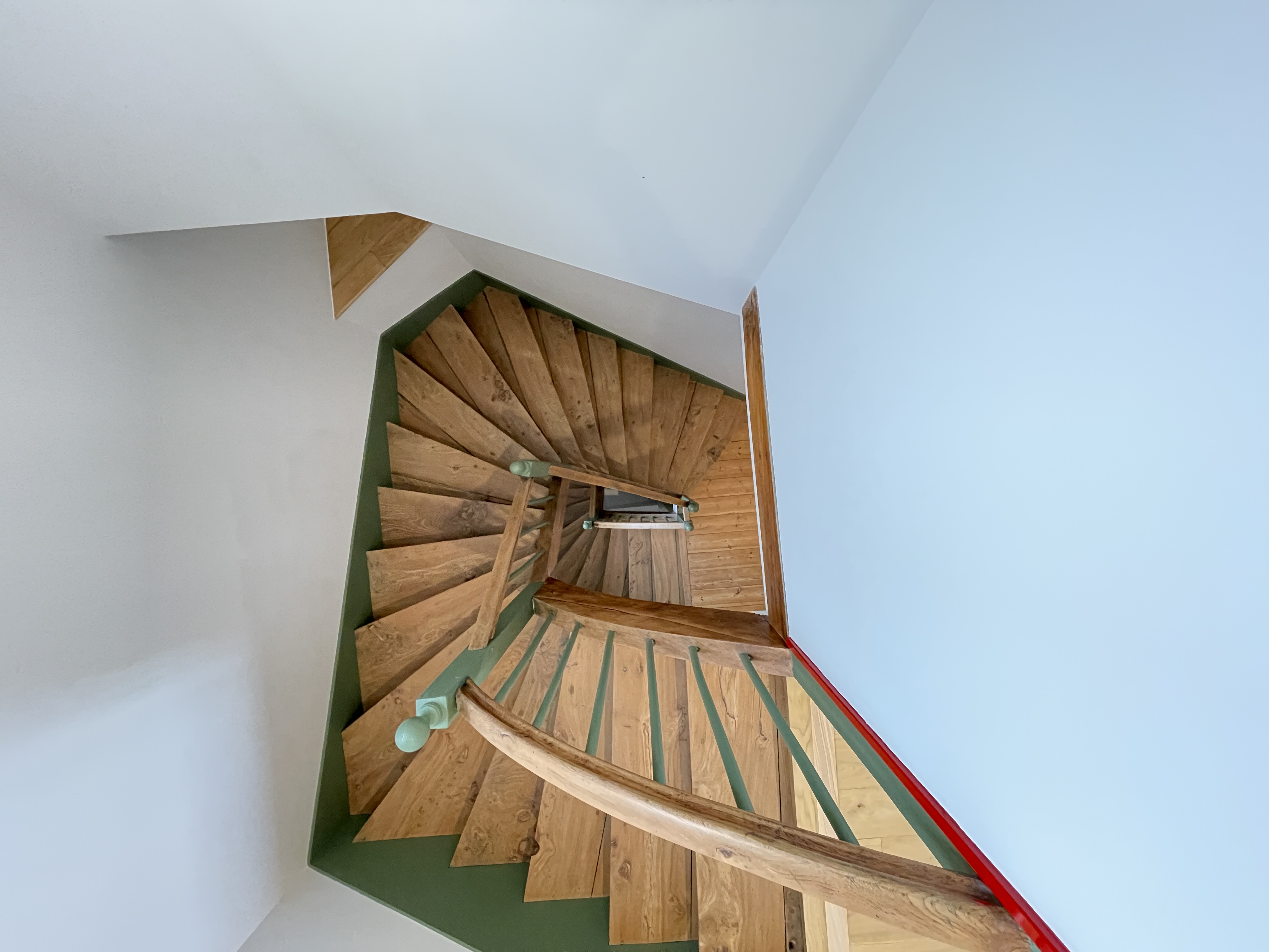 À cette contrainte logistique s’ajoutait une configuration intérieure atypique : volumes irréguliers, niveaux imbriqués, grande cage d’escalier centrale et espaces en biais réduisant les possibilités d’aménagement. Chaque choix devait conjuguer esthétique, fonctionnalité et optimisation des surfaces.