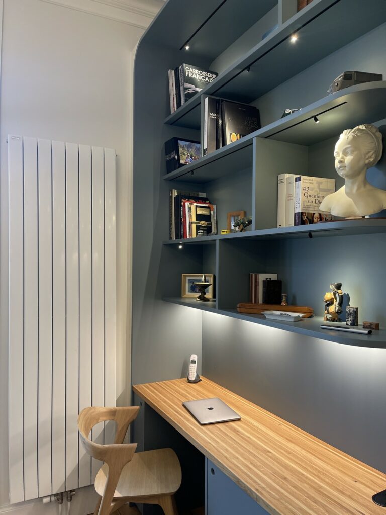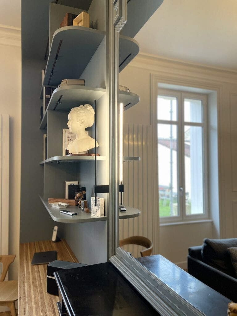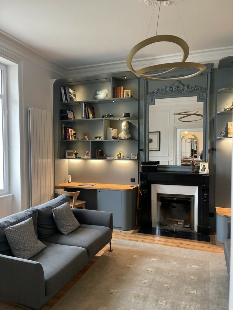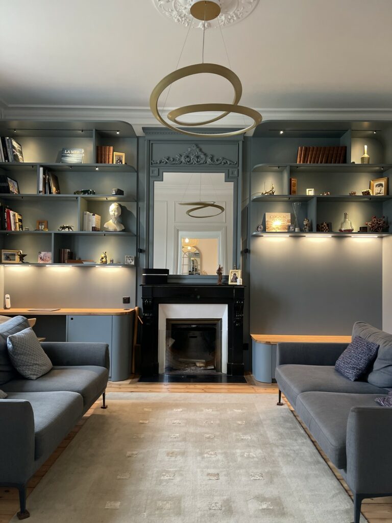 Le salon de 20m² est devenu un espace à la fois chaleureux et fonctionnel grâce à une bibliothèque intégrée qui structure la pièce tout en offrant plusieurs usages. Elle est doté d’un éclairage modulable pour mettre en valeur les objets décoratifs. Pour accentuer l’esprit classique du lieu, des moulures ont été ajoutées au plafond et aux murs. Enfin, une palette de tons blancs lumineux a été choisie pour compenser le manque de lumière naturelle.