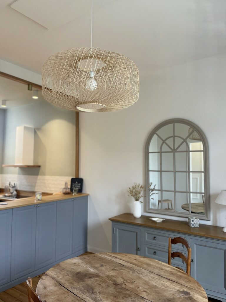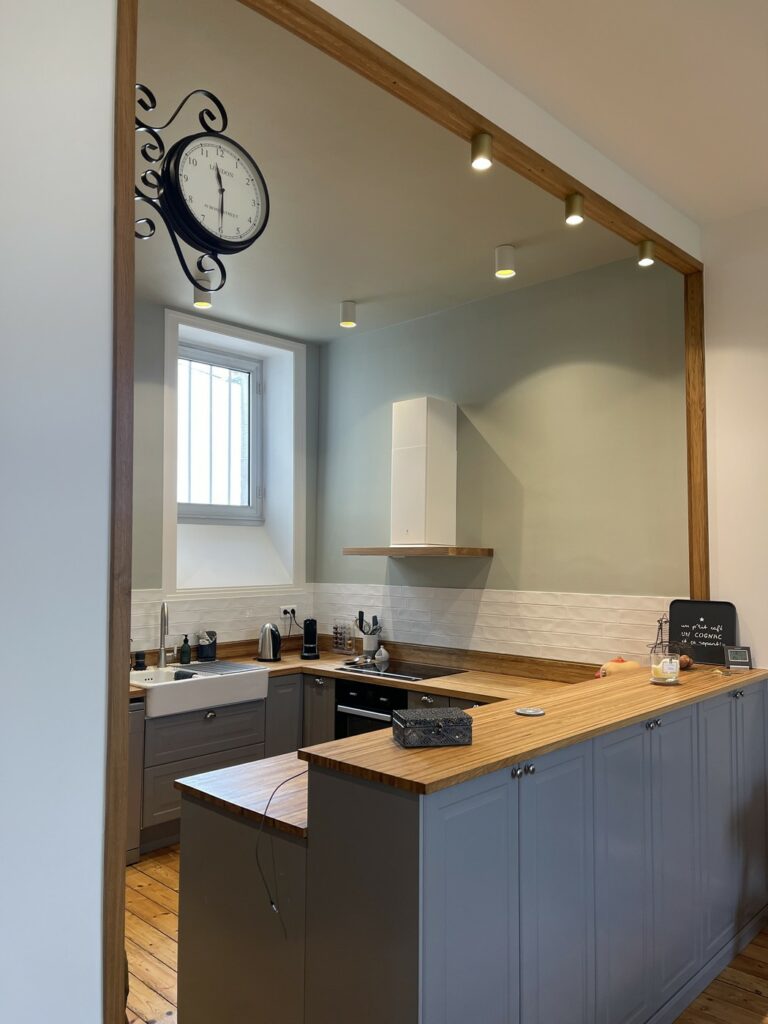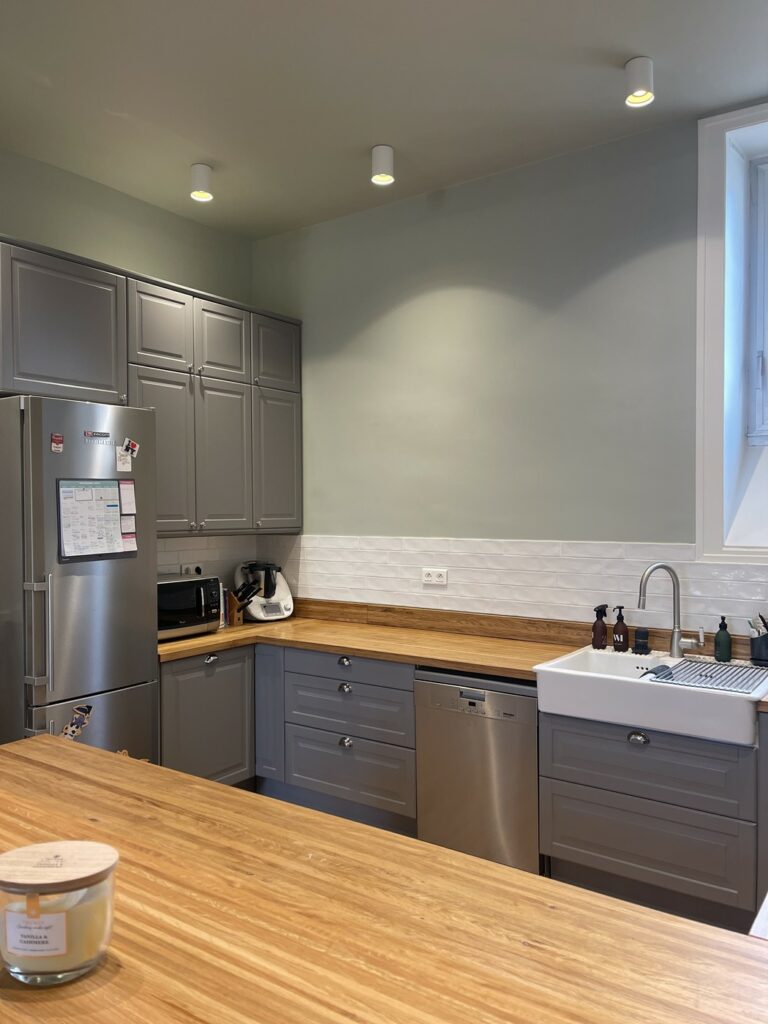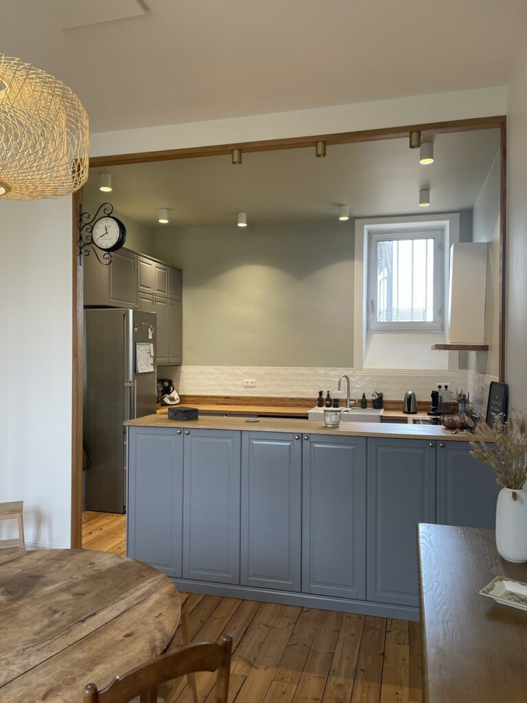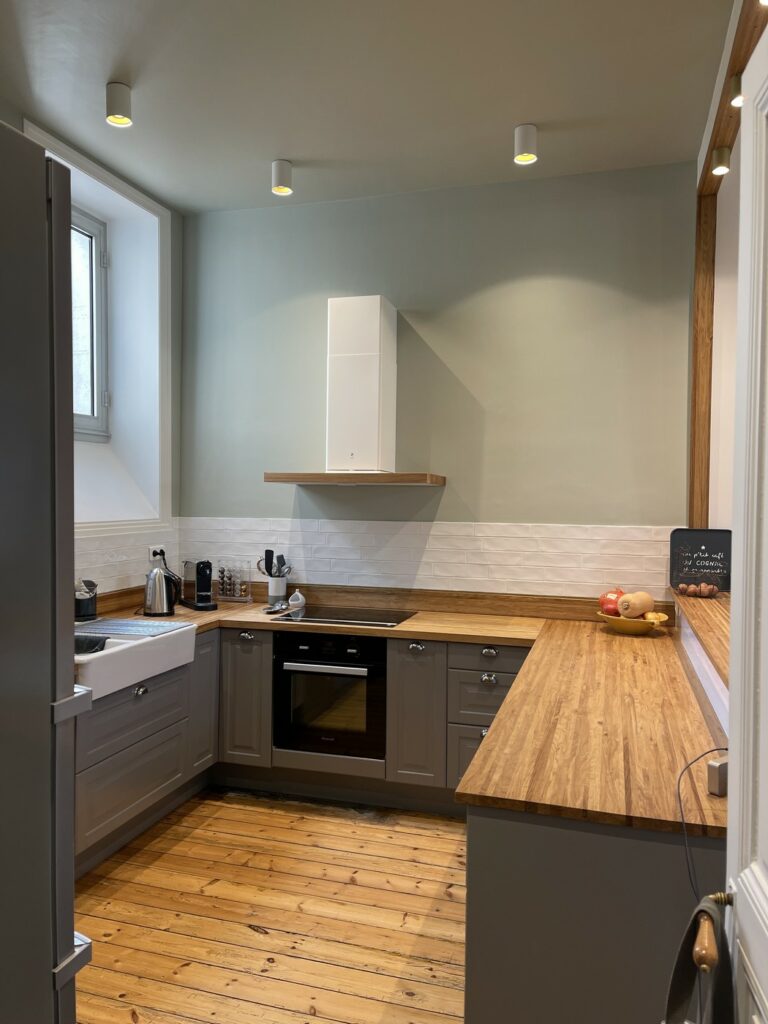 L’espace cuisine – salle à manger étant ouvert, il a fallu structurer les volumes et apporter du confort en délimitant les espaces par une peinture vert amande et une structure en chêne, retravailler l’éclairage plus fonctionnel et discret, remplacer la crédence par une élégante faïence en zellige.