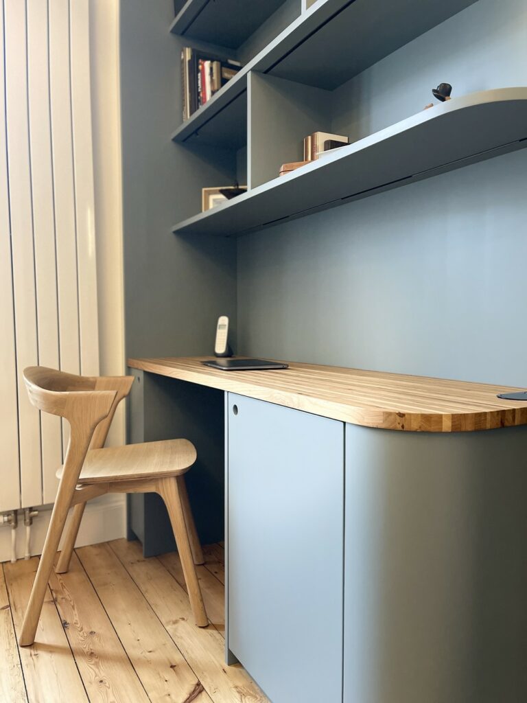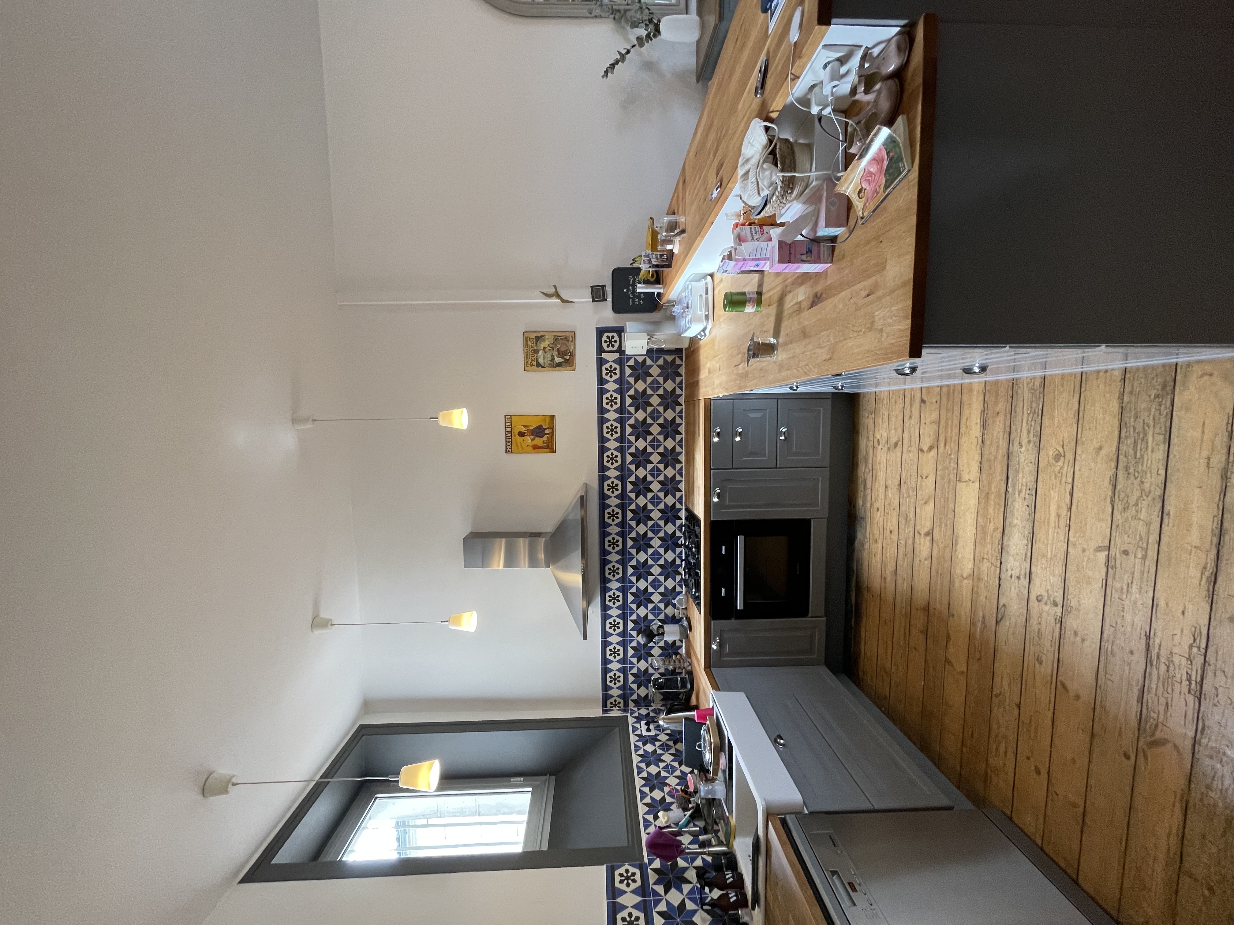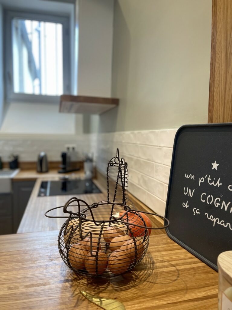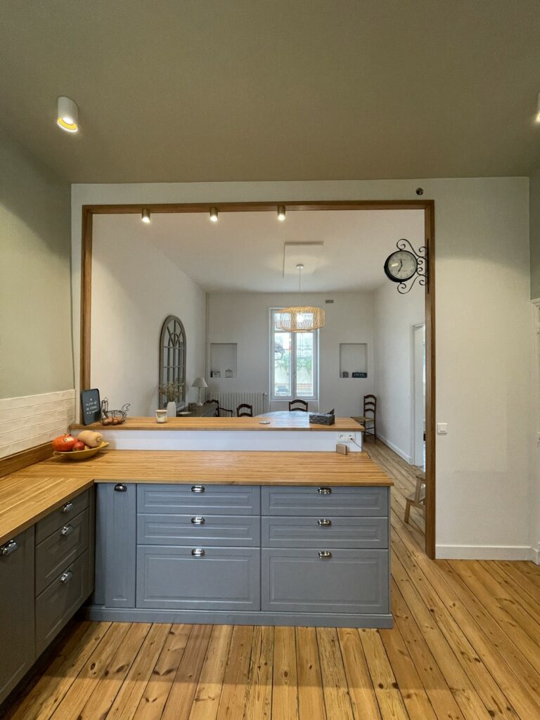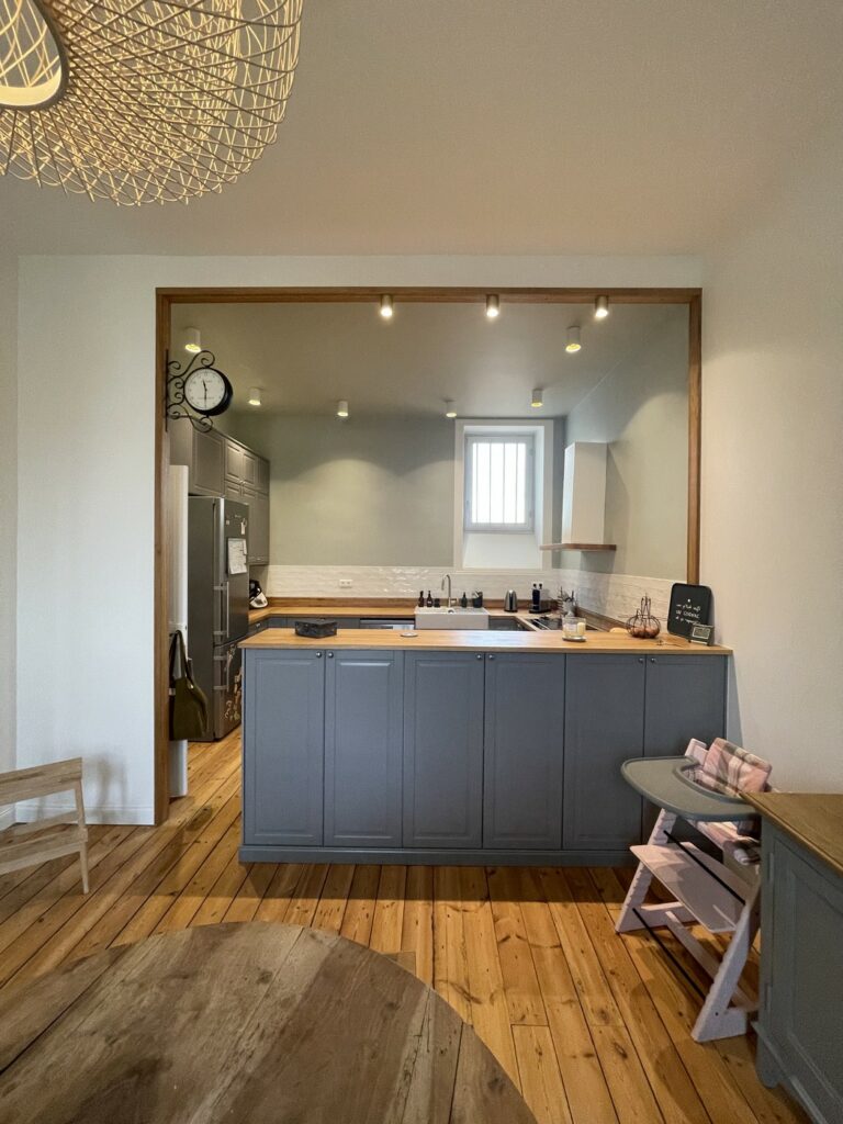 L’espace cuisine – salle à manger étant ouvert, il a fallu structurer les volumes et apporter du confort en délimitant les espaces par une peinture vert amande et une structure en chêne, retravailler l’éclairage plus fonctionnel et discret, remplacer la crédence par une élégante faïence en zellige.