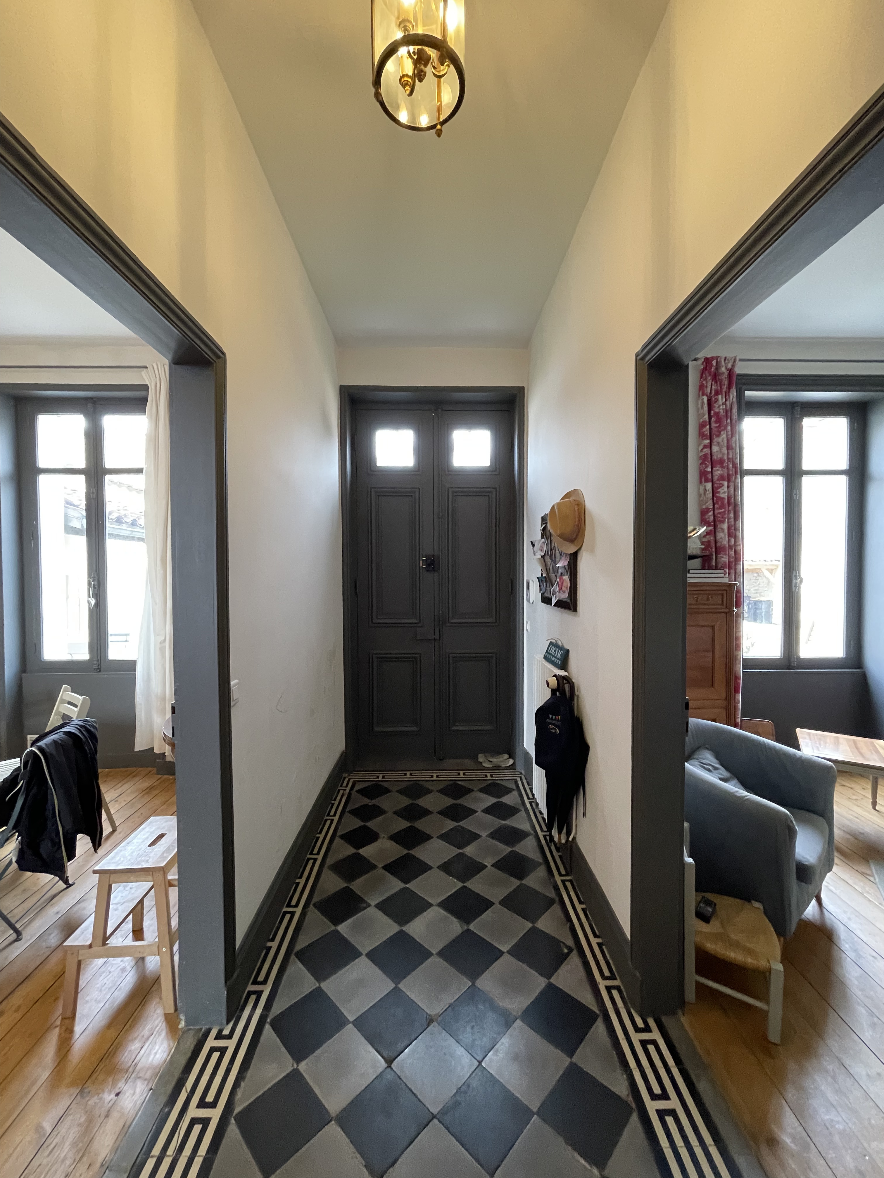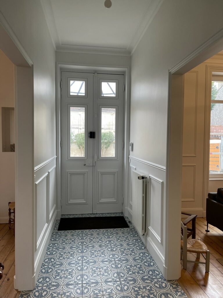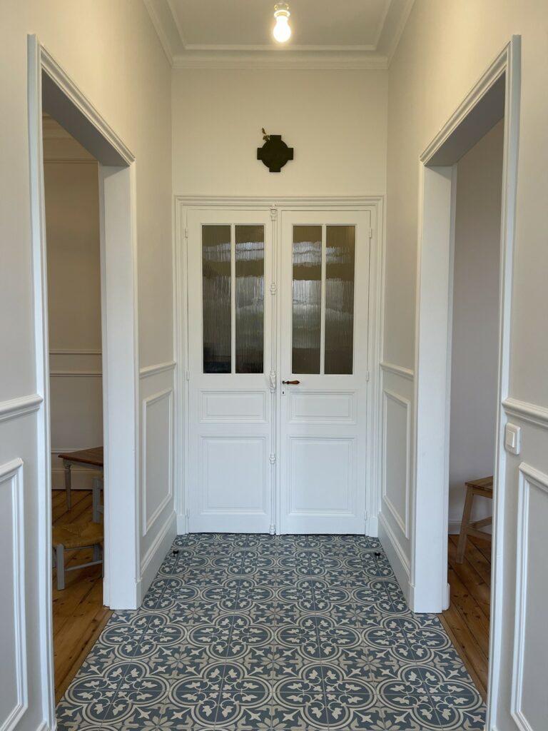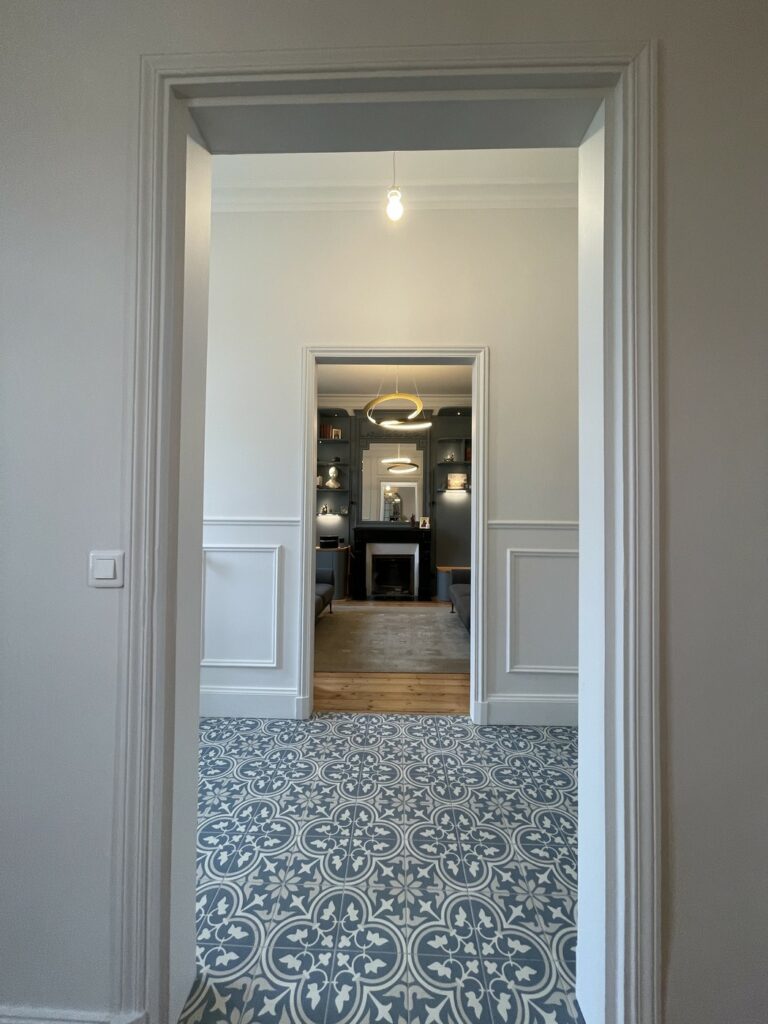 Initialement sombre et sans relief, l’entrée a été repensée par la pose de moulures murales et au plafond et un nouveaux sol en carreaux de ciment aux nuances de bleu – gris apporte du caractère et s’harmonise avec l’ensemble du projet.