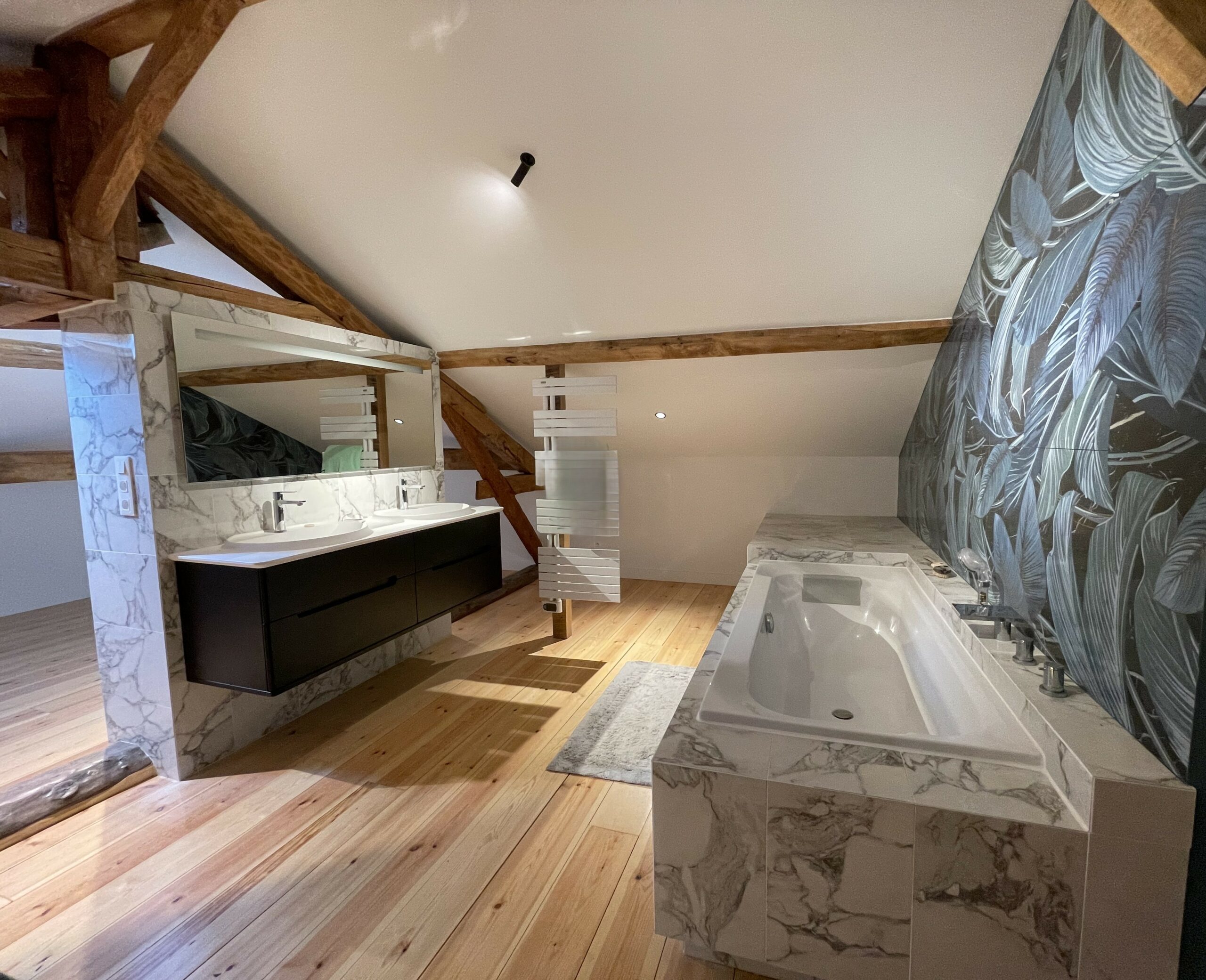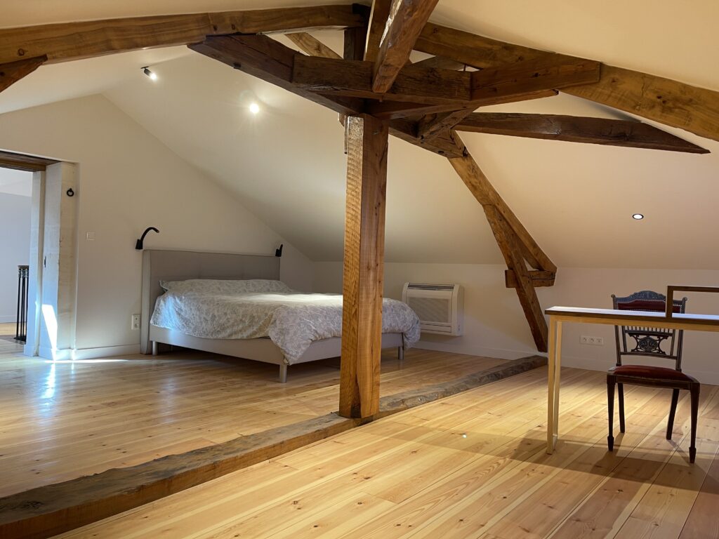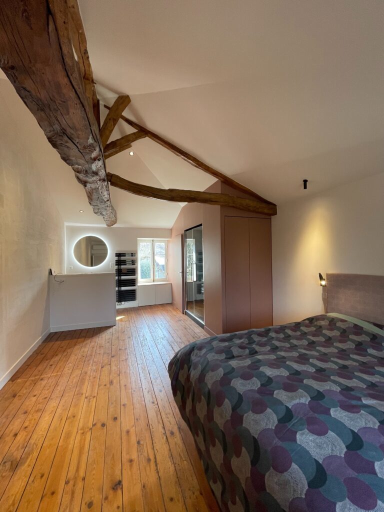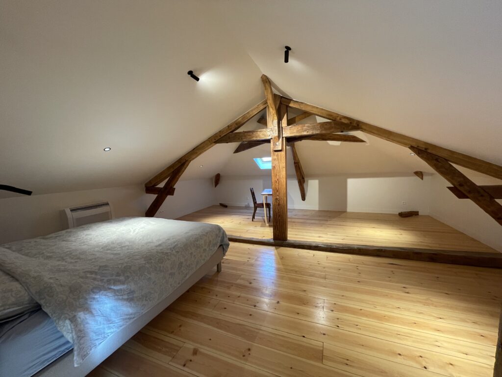 Ce projet ambitieux a permis de transformer des combles non aménagés en un espace habitable comprenant un grand palier, une chambre et une salle de bain. Il a été nécessaire de déposer le plancher existant afin de le remplacer après avoir recalé et renforcé le solivage.